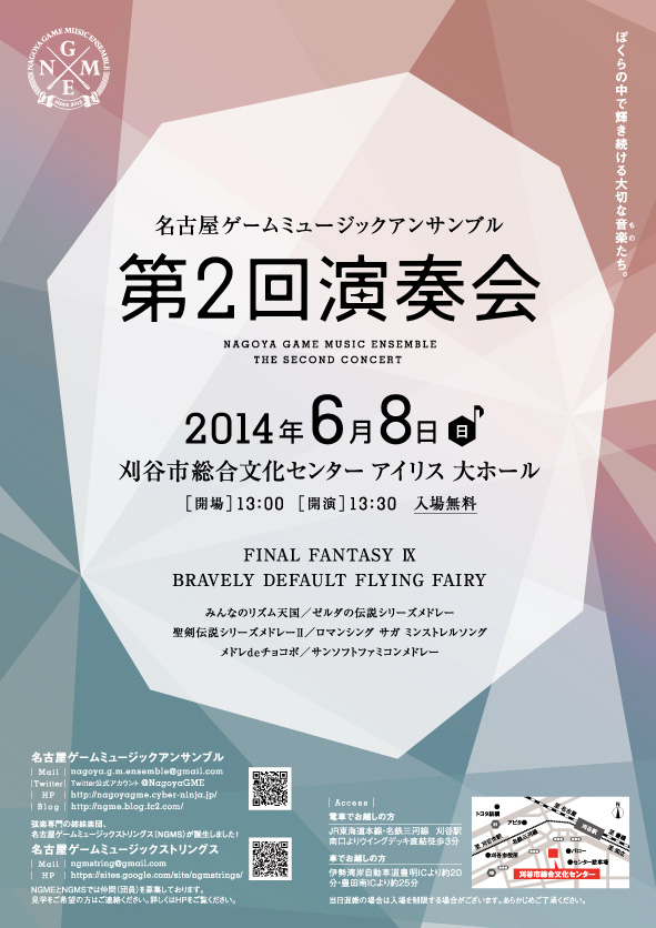 2014年6月8日(日)に刈谷市総合文化センターにて名古屋ゲームミュージックアンサンブルが「第2回演奏会」を開催いたします。