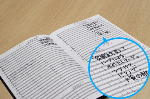 ここに私の手書きで恥ずかしいのですが、台本が書いてあるんです。で、ページをめくると……、楽譜の流れにあわせて、「このタイミングでこのナレーションをしゃべってください」というような指示が全部入ってるんですね。