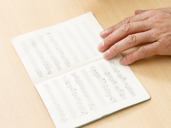 岩垂氏が常に持ち歩いているというミニ五線譜。複数ページに渡って“楽曲のネタ”がぎっりし書き込まれている